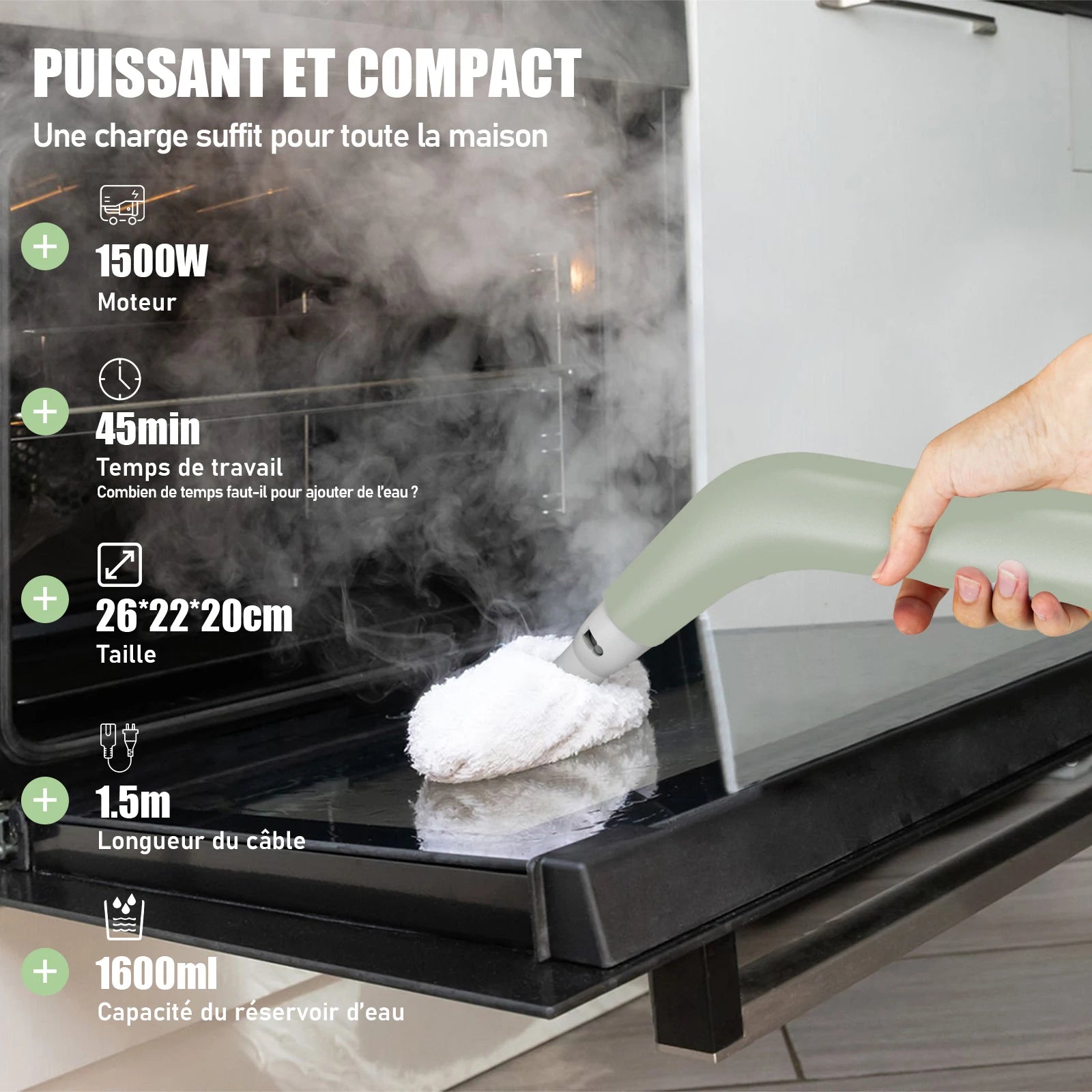Avec ses 1500W de puissance, il génère une vapeur haute température capable de désincruster les saletés, dissoudre les résidus et éliminer jusqu’à 99 % des bactéries.